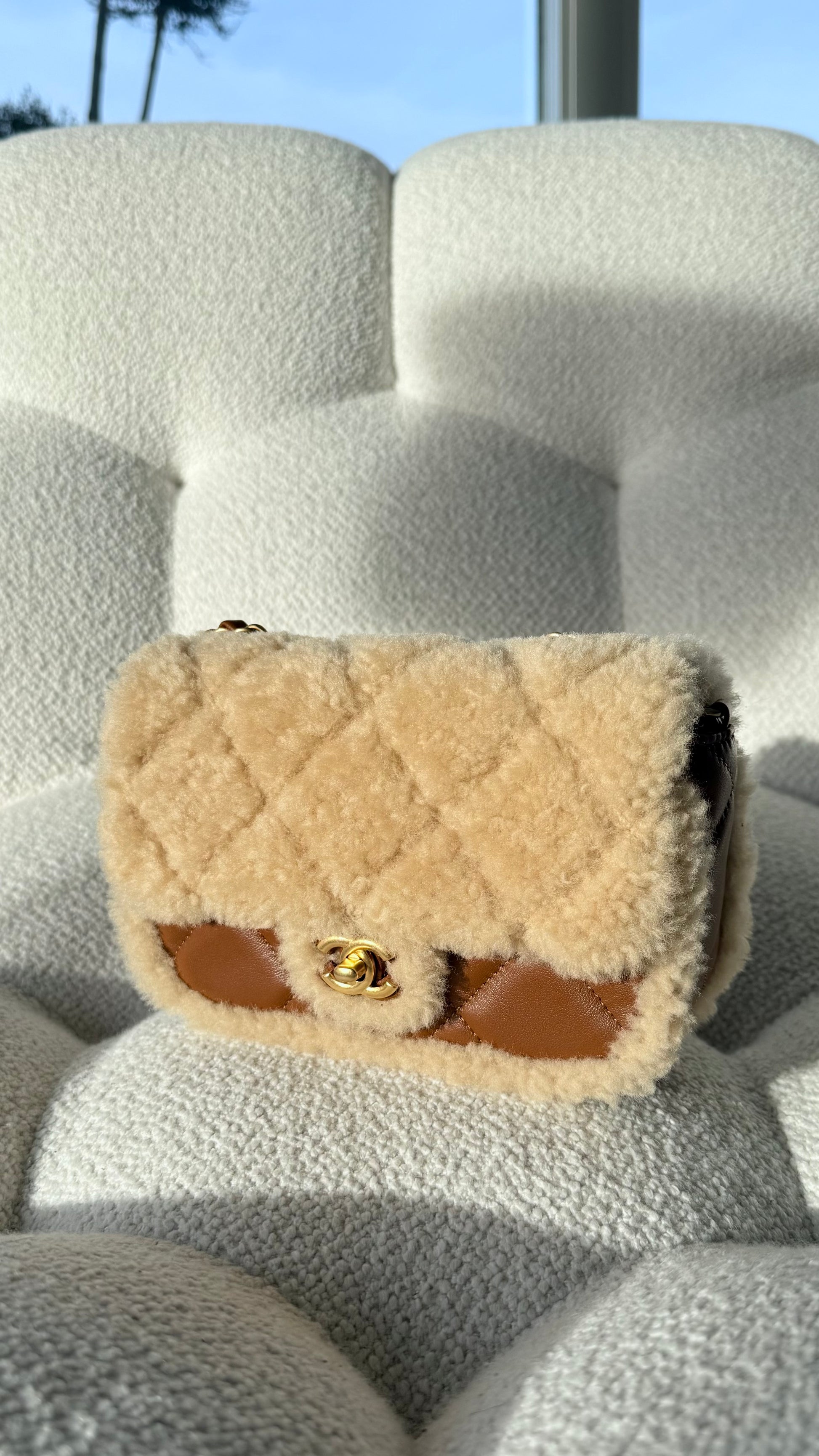 Style: Mini Flap Bag Shearling & Lambskin Beige & Brown Gold-Tone Metal