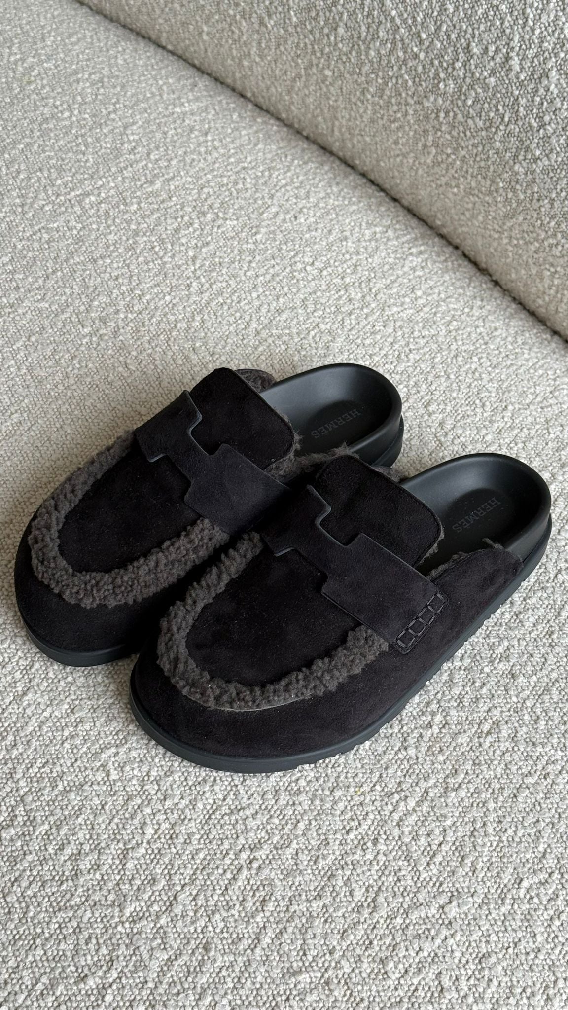 Hermès Go Mules Suede & Shearling Black & Gris Fonce